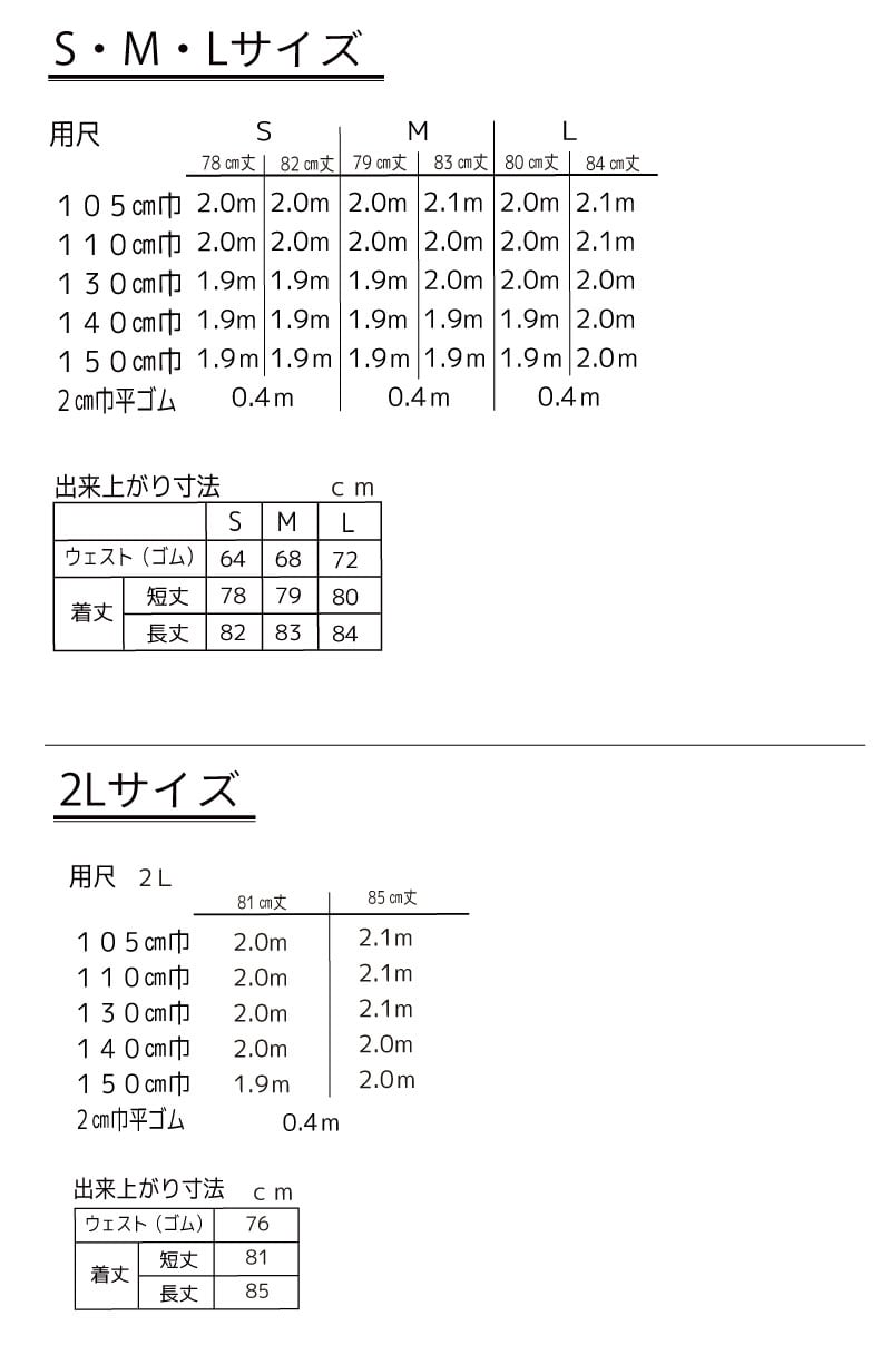 105cm巾 S 2.0m/M 2.0〜2.1m/L 2.0〜2.1m