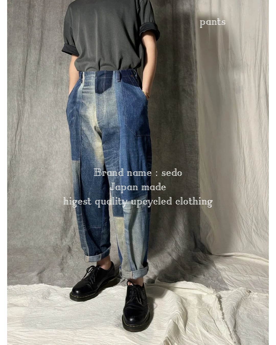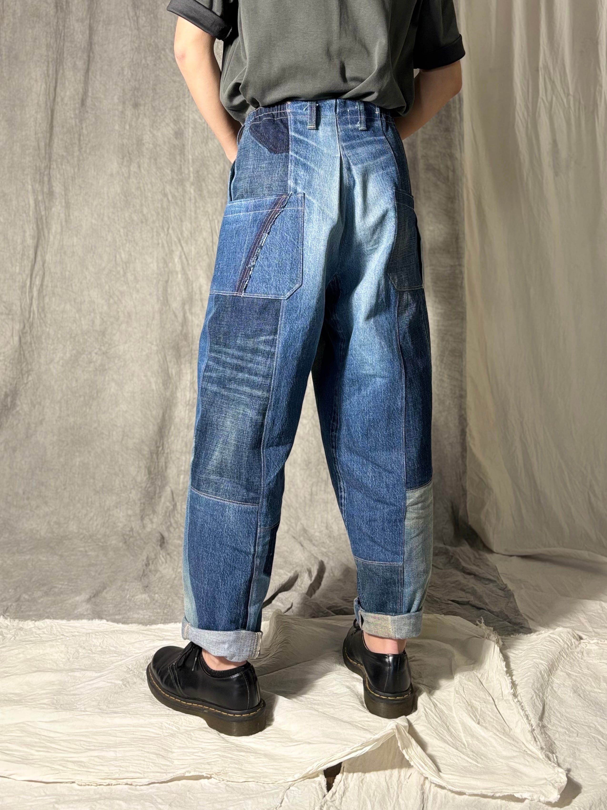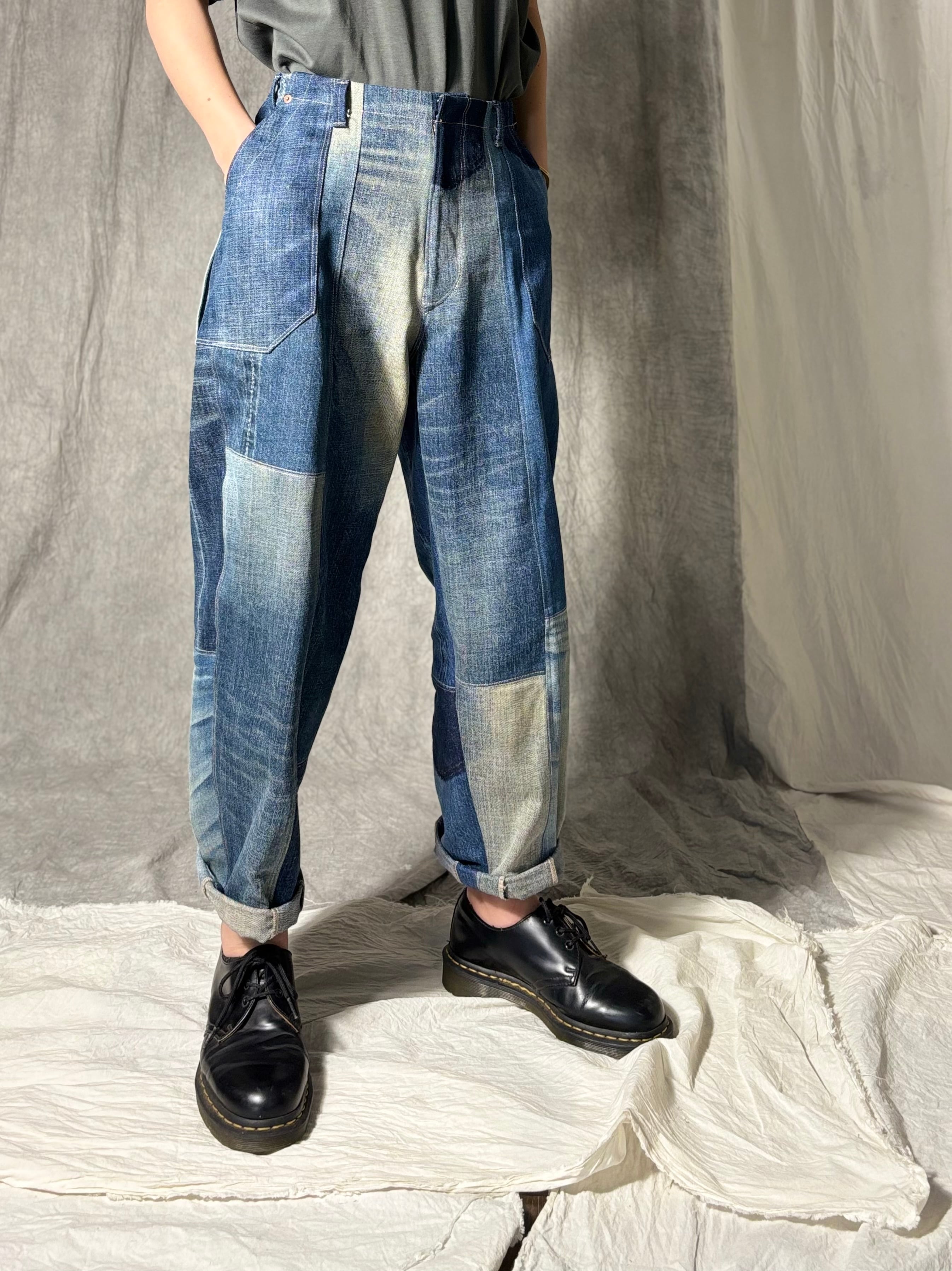 Upcycled denim pants reconstructed from multiple vintage denim pieces, carefully deconstructed and reassembled into panel form.