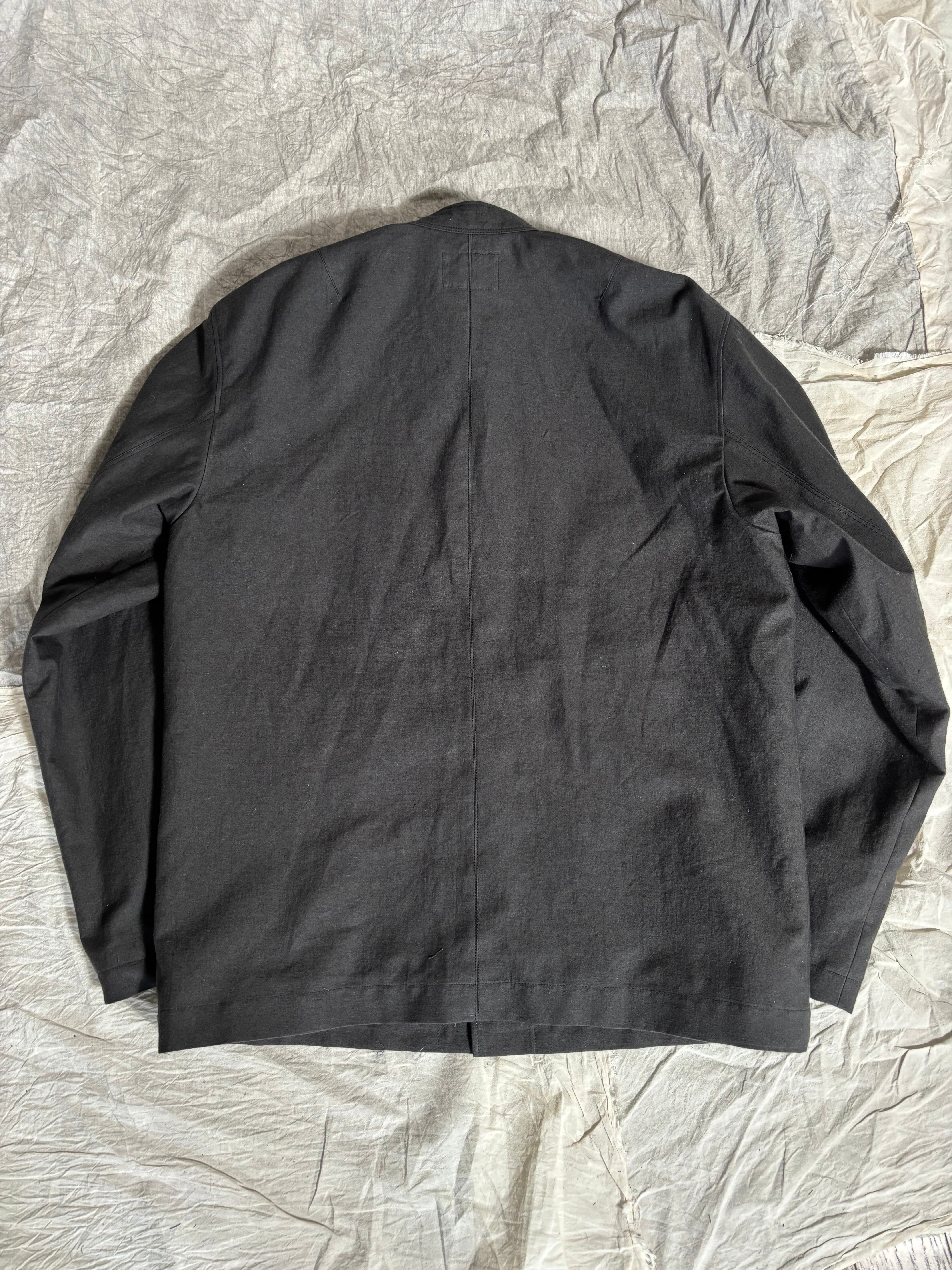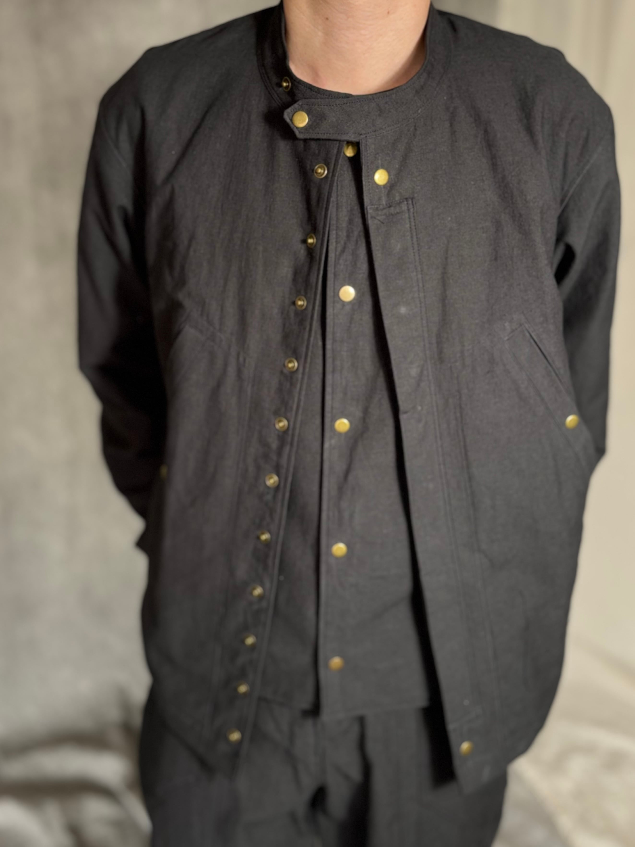 ノーカラーのミニマルなジャケットと