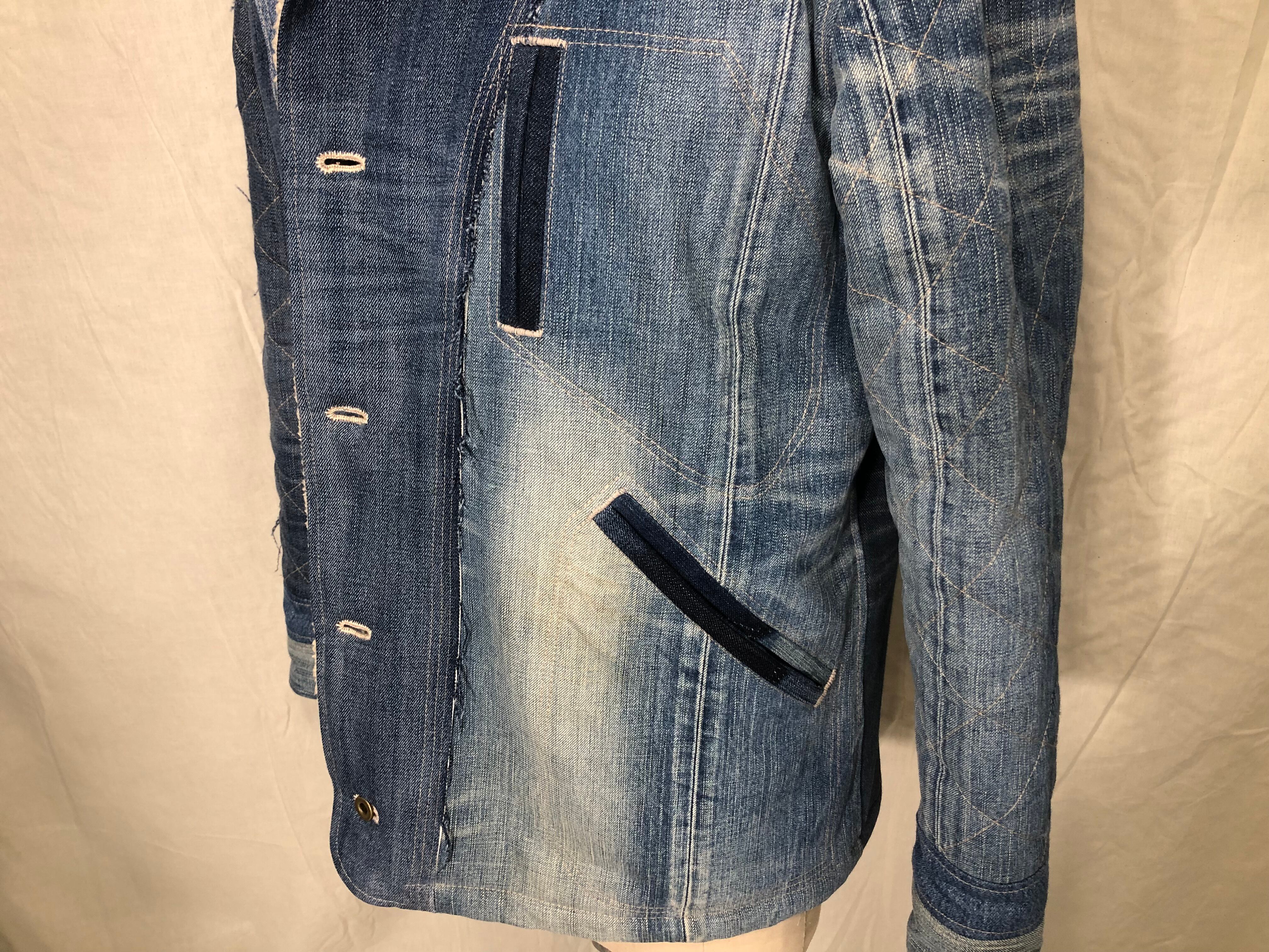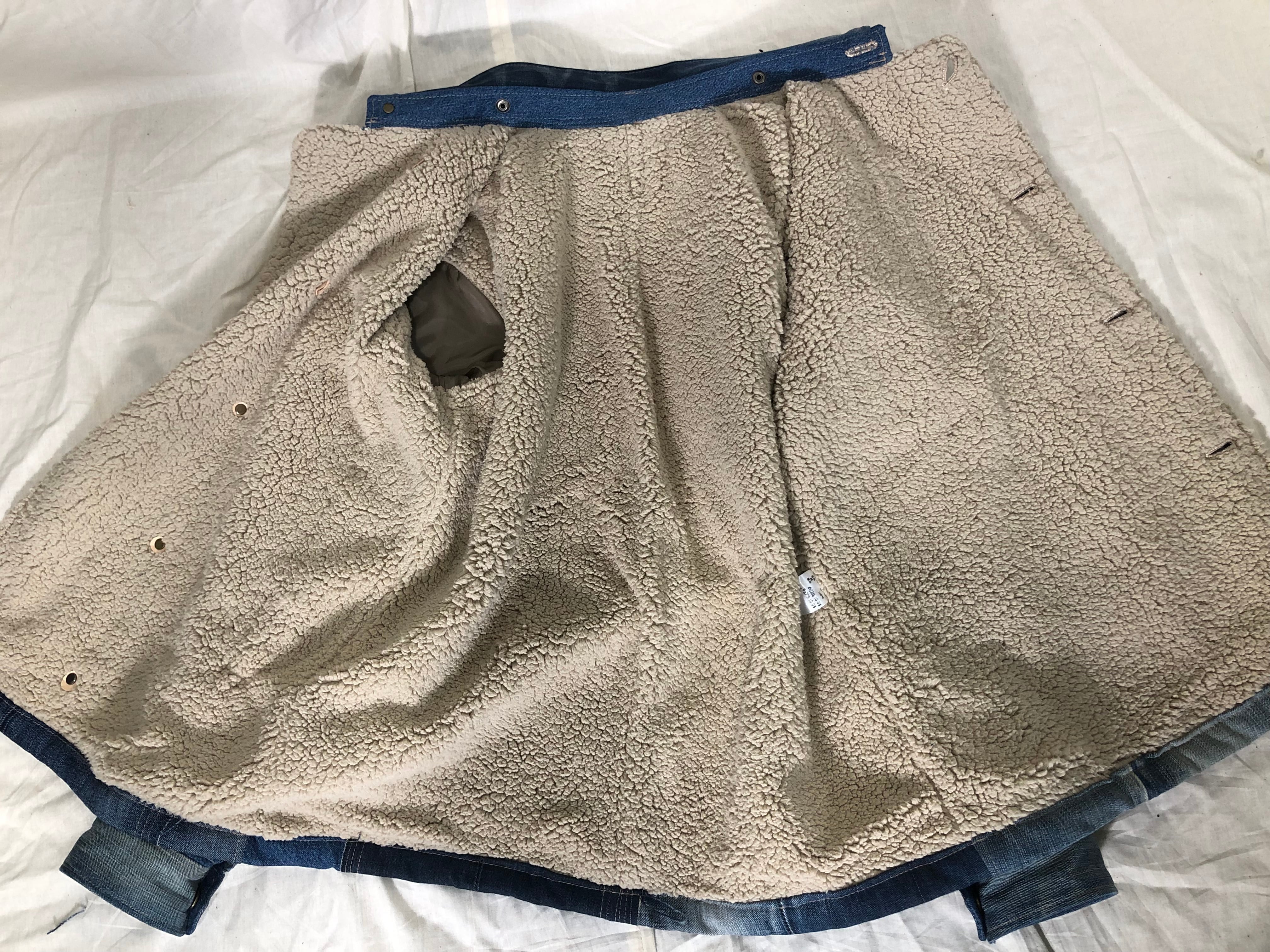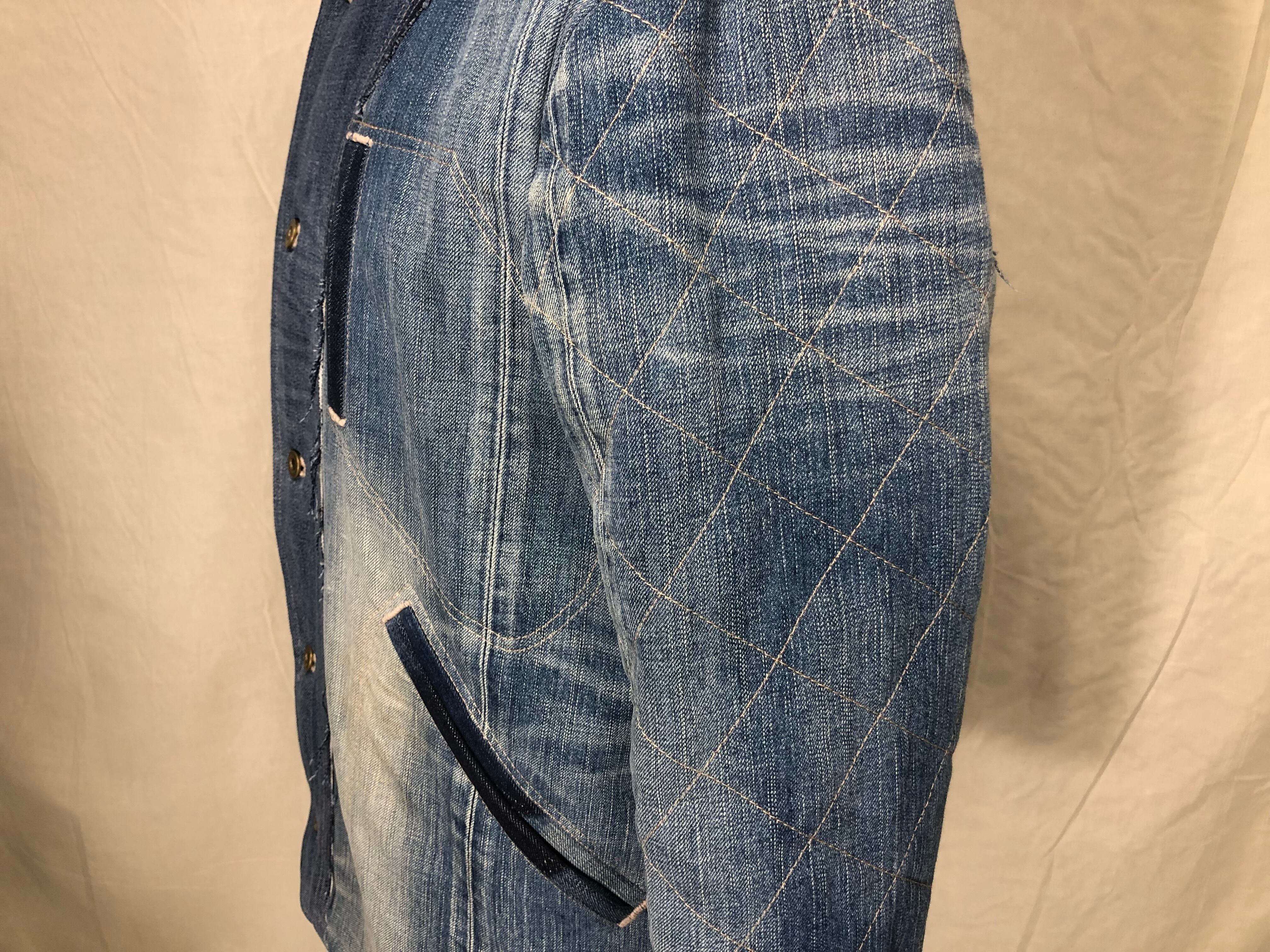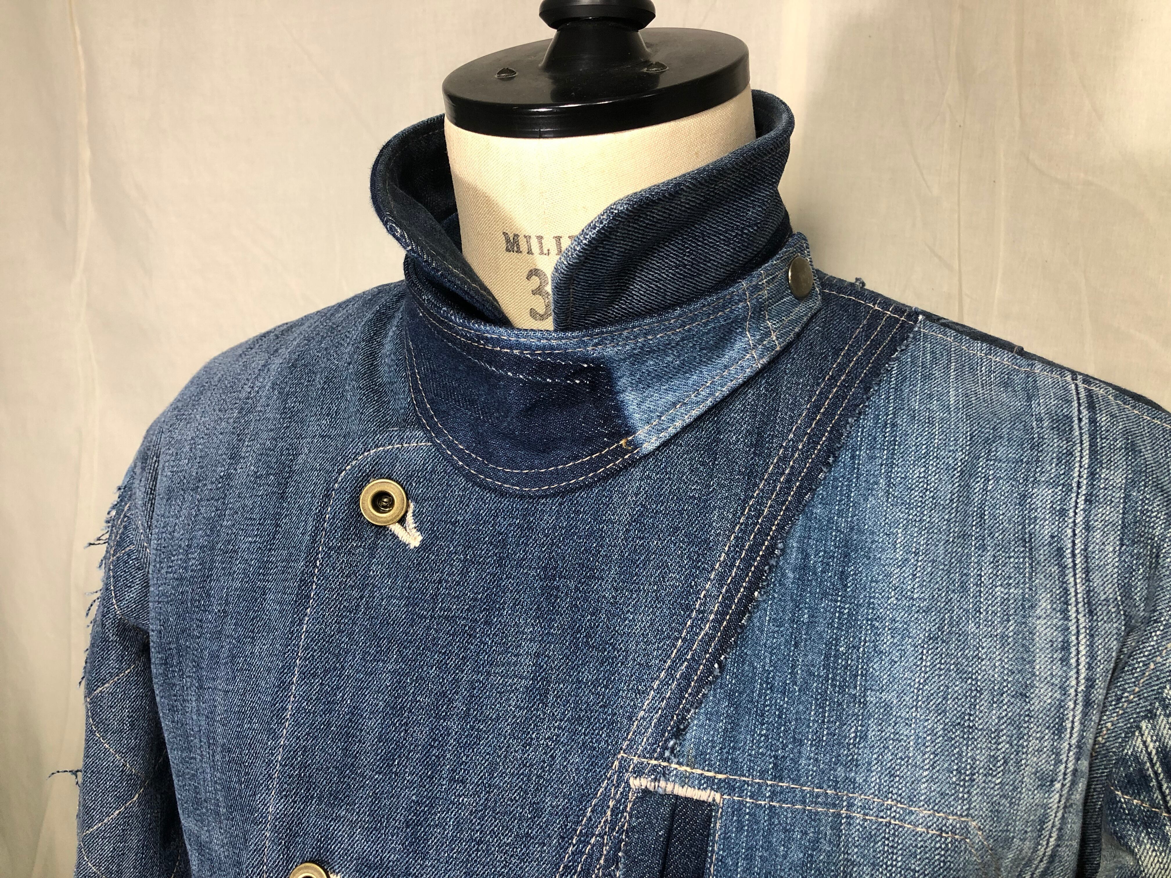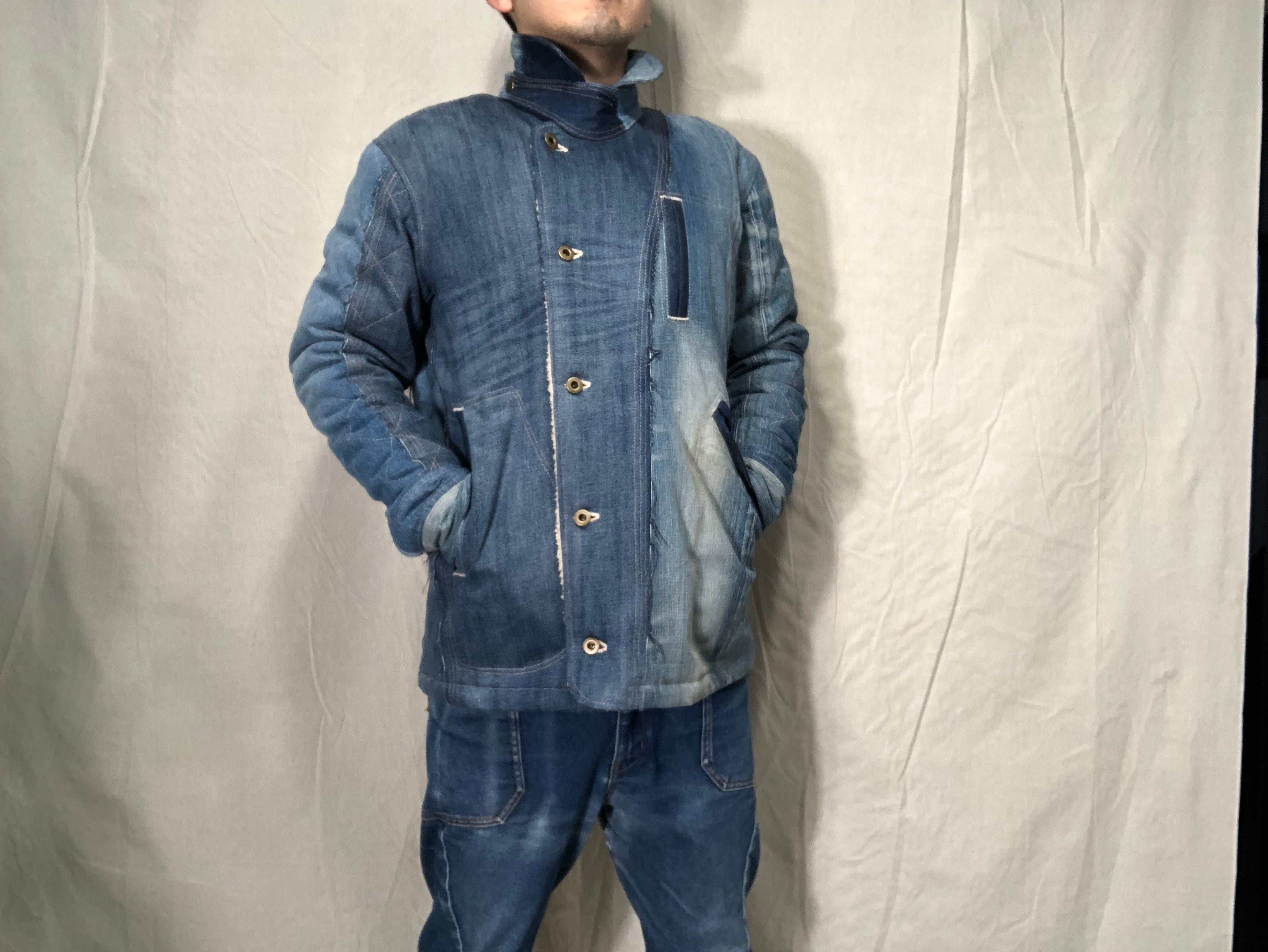 表地は古着のジーンズを、ほどいて接ぎ合わせて作った一点物です。